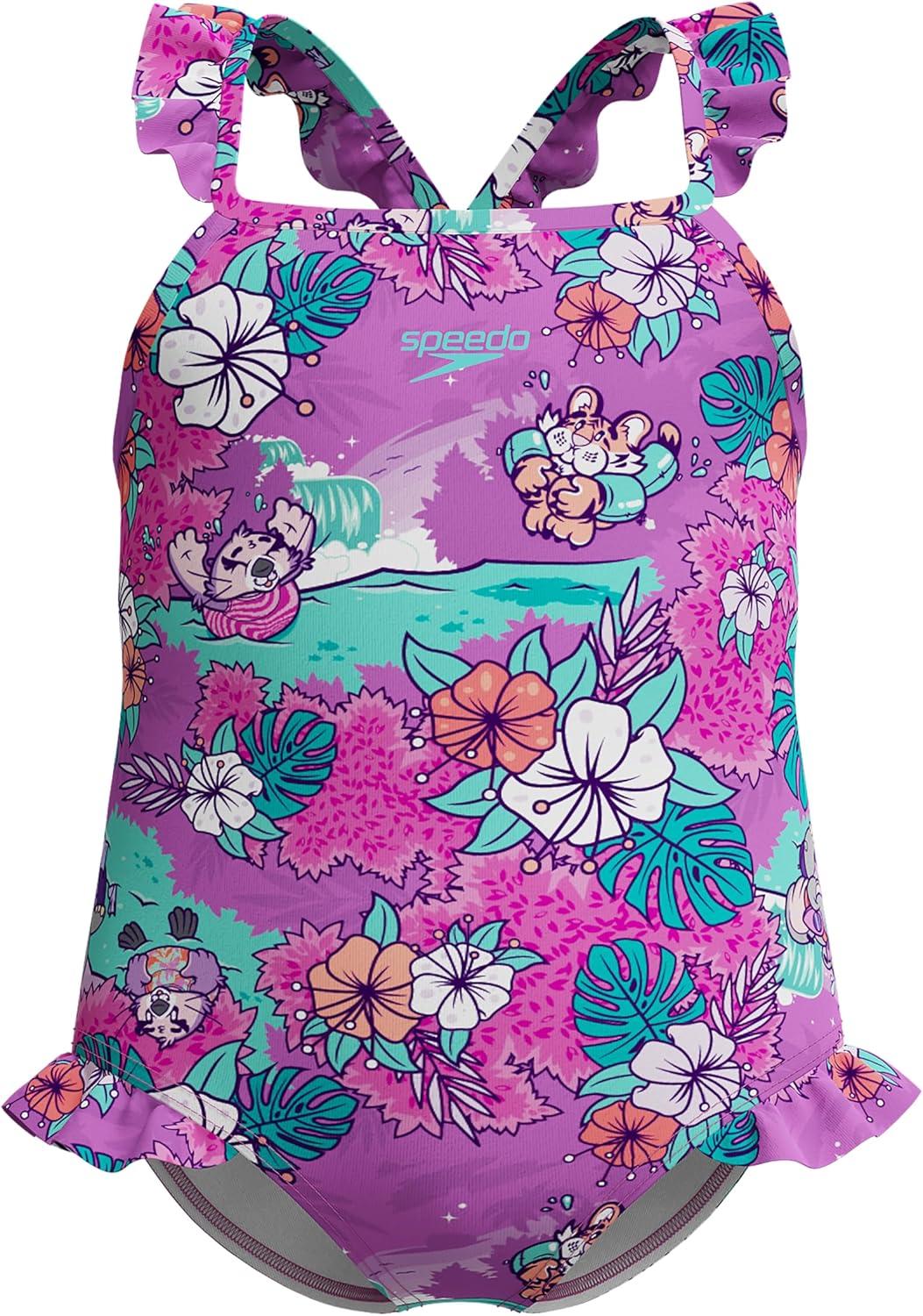 Speedo Baby-Girls Swimsuit Infant to Big Kid UPF 50+ Learn to Swim(Frill 1pc Neon Violet/Splash Bash)