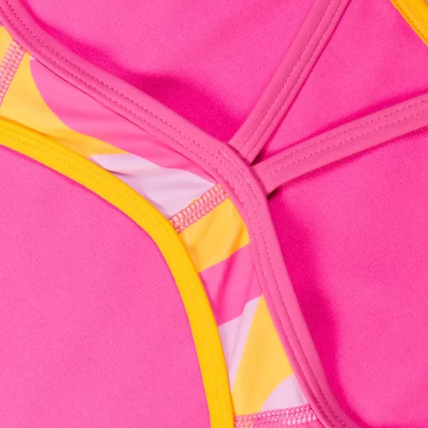 Keep her pool look classic with this solid swimsuit, featuring a colorful logo graphic. It's made from fabric that resists chlorine and pilling for durability that can withstand splashes and washing. Finished with Block the Burn UPF 50+ sun protection, this suit has it all.