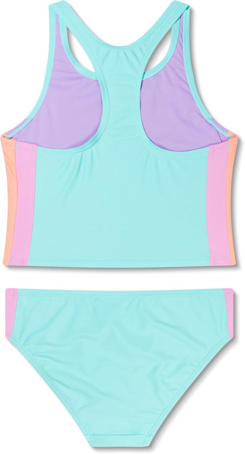 Fun in the sun awaits. She'll love swimming in this durable two-piece set, featuring a color-block logo tank top with a sporty racerback. The matching bottom is solid for easy mixing and matching. Block the Burn UV50+ sun protection makes it easy for her to play all day.