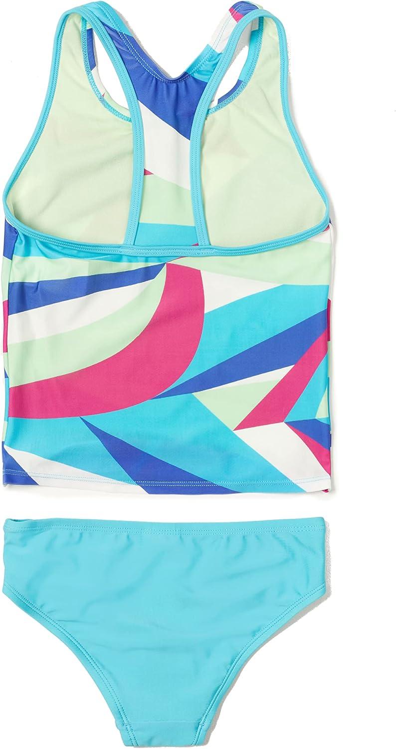 Fun in the sun awaits. She'll love swimming in this durable two-piece set, featuring a color-block logo tank top with a sporty racerback. The matching bottom is solid for easy mixing and matching. Block the Burn UV50+ sun protection makes it easy for her to play all day.