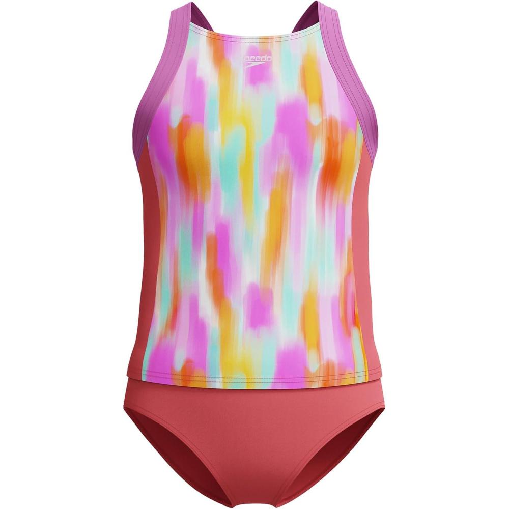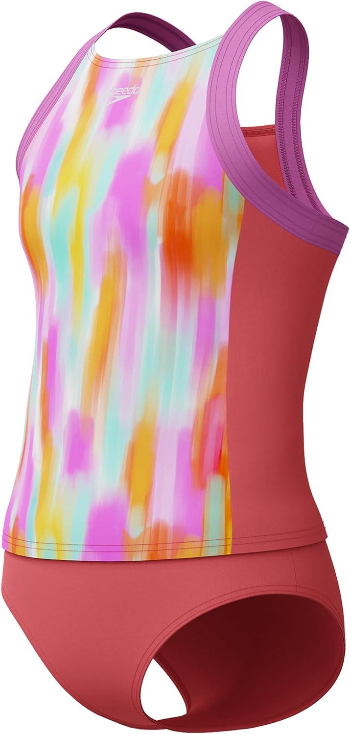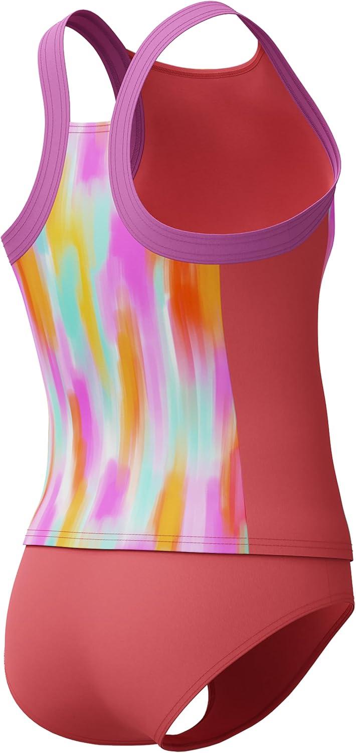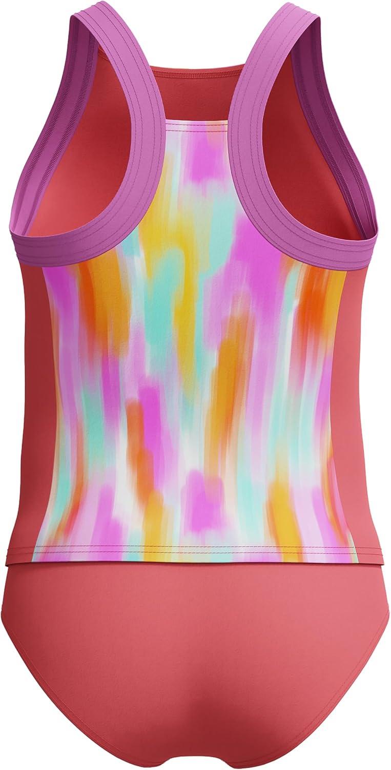 Fun in the sun awaits. She'll love swimming in this durable two-piece set, featuring a color-block logo tank top with a sporty racerback. The matching bottom is solid for easy mixing and matching. Block the Burn UV50+ sun protection makes it easy for her to play all day.