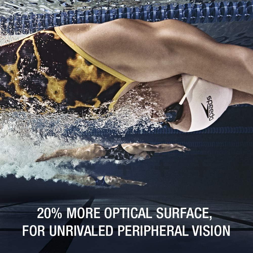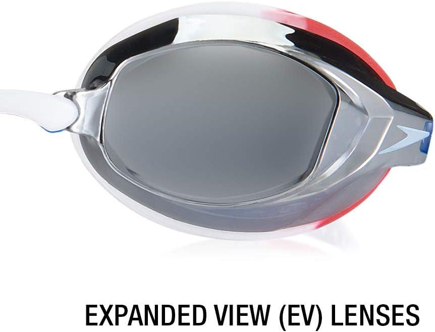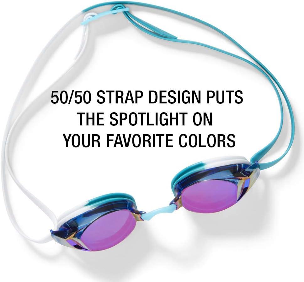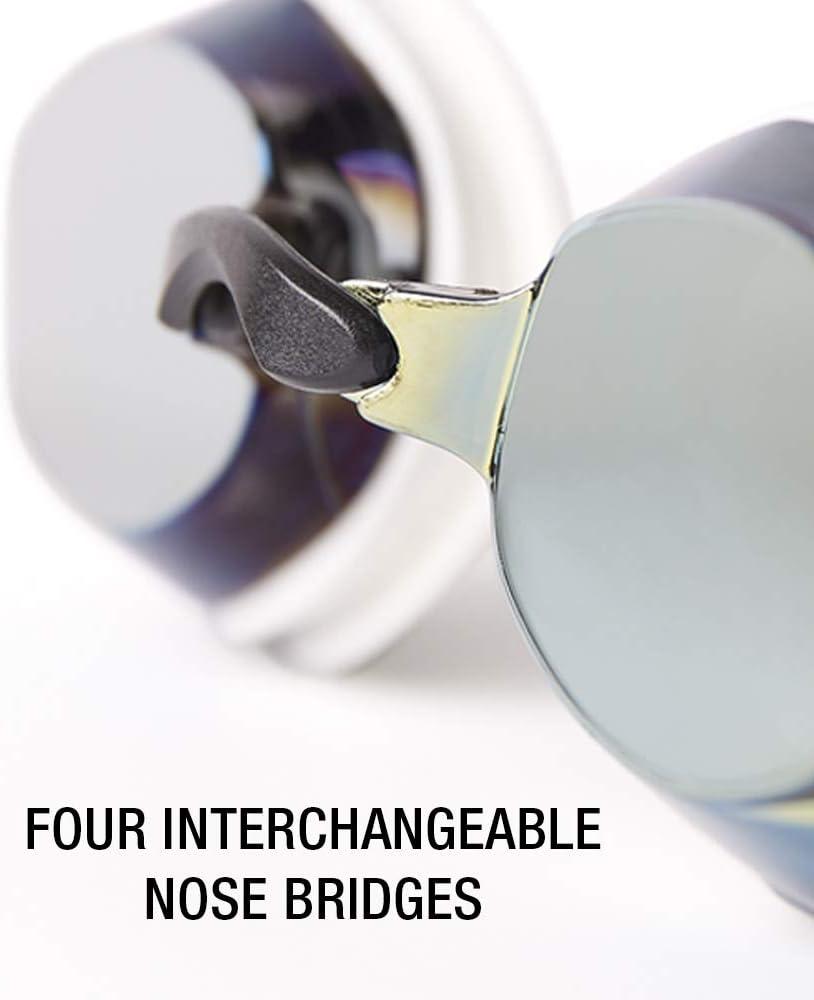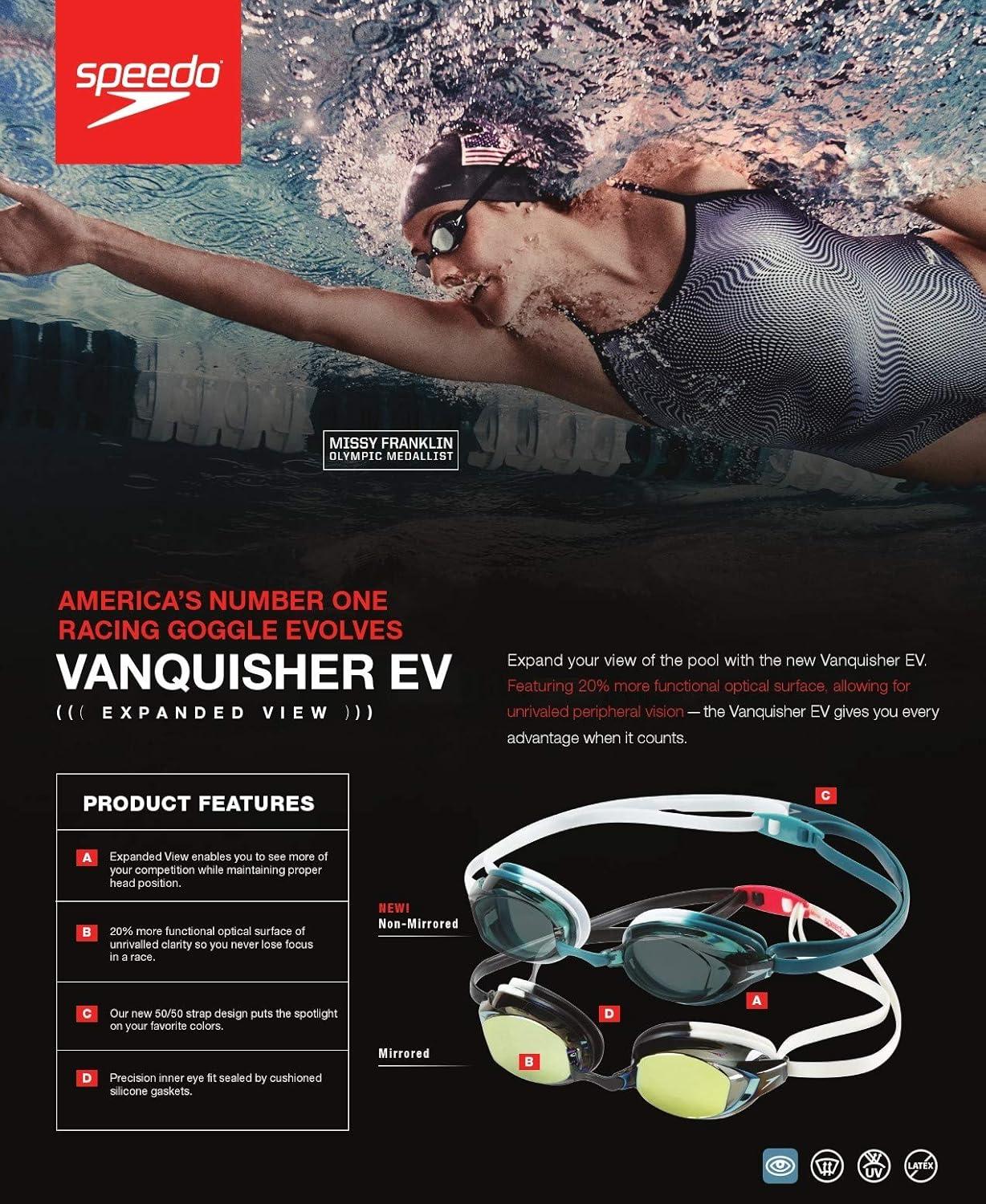 America's #1 racing goggle is now better than ever. The Vanquisher EV features 20% more functional optical surface than its predecessor (Vanquisher 2.0) for unmatched peripheral vision underwater. You can also expect the same precision fit and anti-drag design that competitive swimmers rely on for comfort and results on race day. Panoramic mirrored anti-glare lenses provide ultimate underwater clarity and significantly reduce water glare. HIGHLIGHTS Panoramic mirrored anti-glare lenses Anti-fog & UV protection 4 interchangeable nose pieces Snug inner-eye fit Latex-free