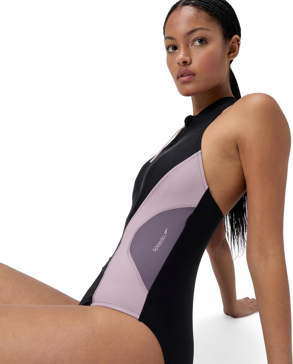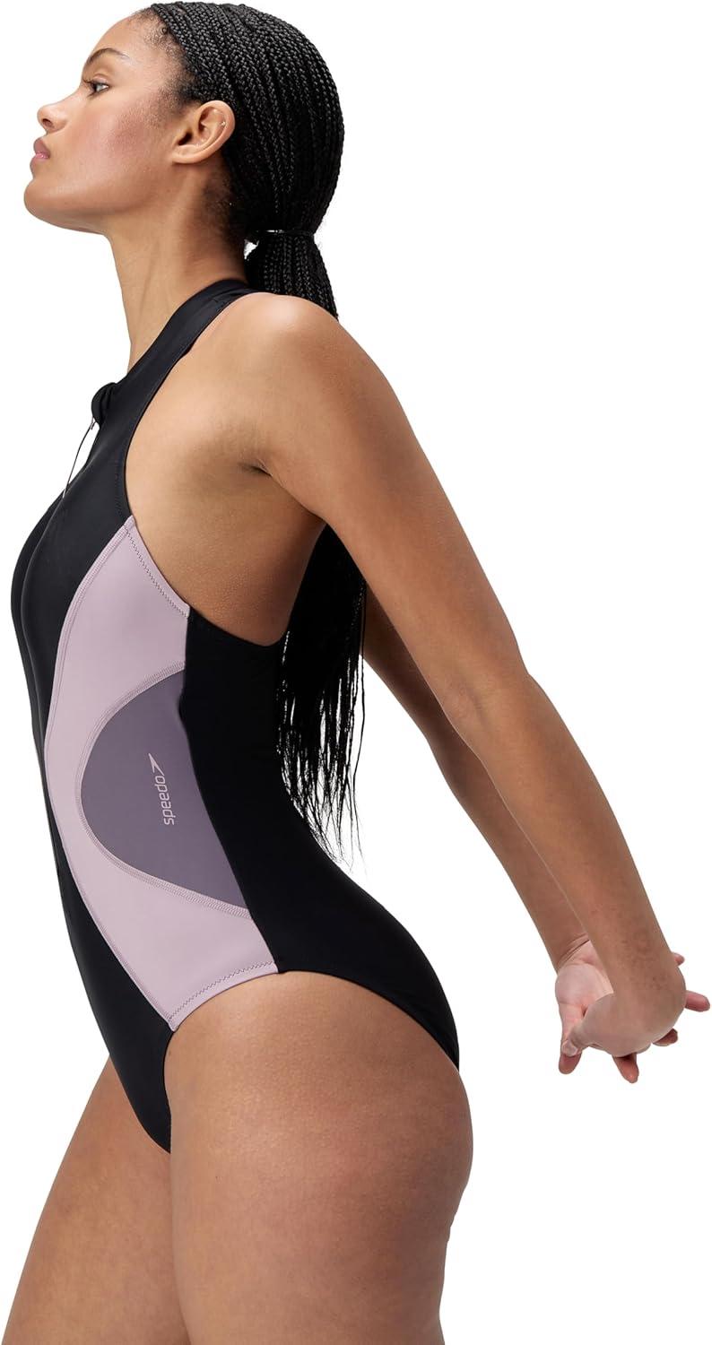 Flex your fitness in our zip-front colour-block swimsuit. The high neck and back deliver a speedy silhouette while flattering colour-block panels dial up the style. Removable bra cups lend shape and support. UPF50+ blocks the burn. Cut from pilling-resistant Enduraflex fabric for higher chlorine resistance and shape retention.