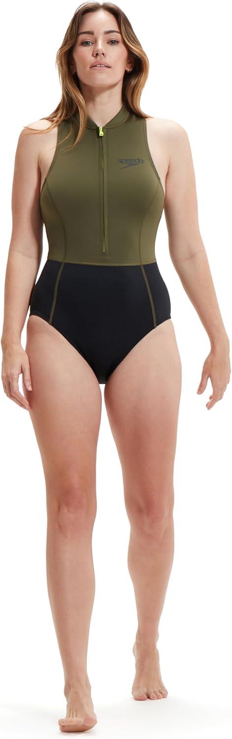 Speedo Women’s Swimsuit One Piece Zip Front Thermal Open Water(Black/Olive Night)