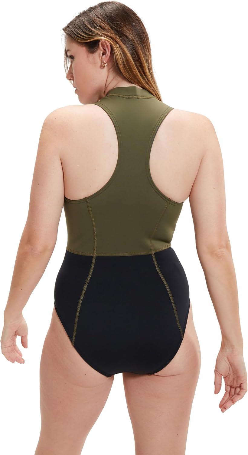Speedo Women's Swimsuit One Piece Zip Front Thermal Open Water(Black/Olive Night)