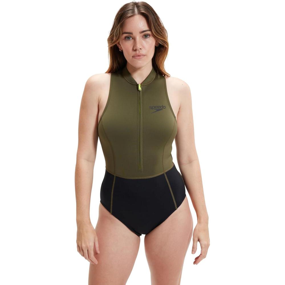 imageSpeedo Womens Swimsuit One Piece Zip Front Thermal Open WaterBlackOlive Night