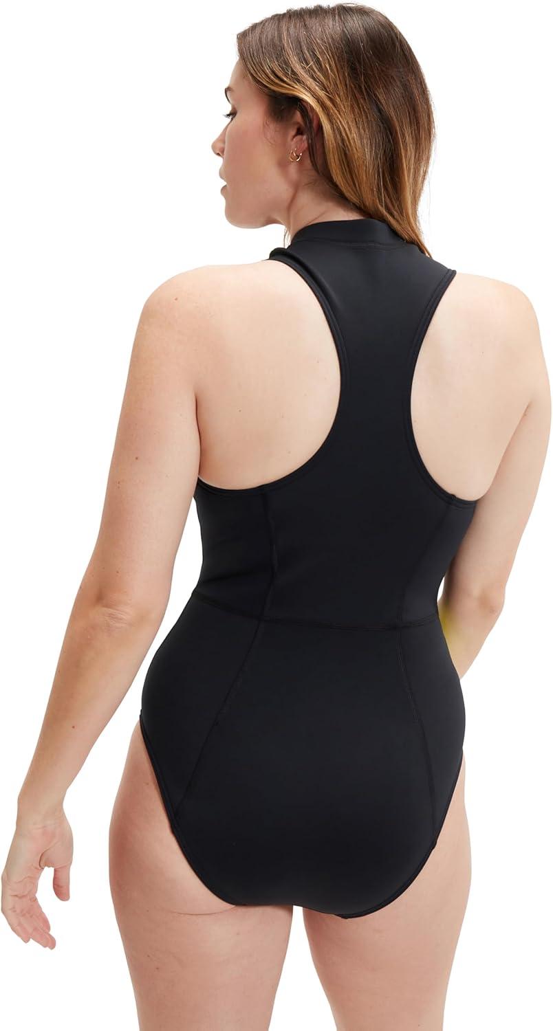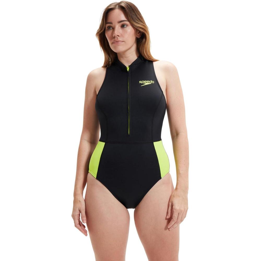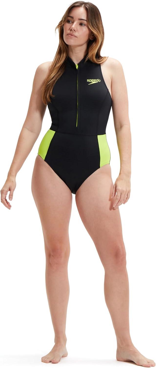 Speedo Women’s Swimsuit One Piece Zip Front Thermal Open Water(Black/Safety Yellow)